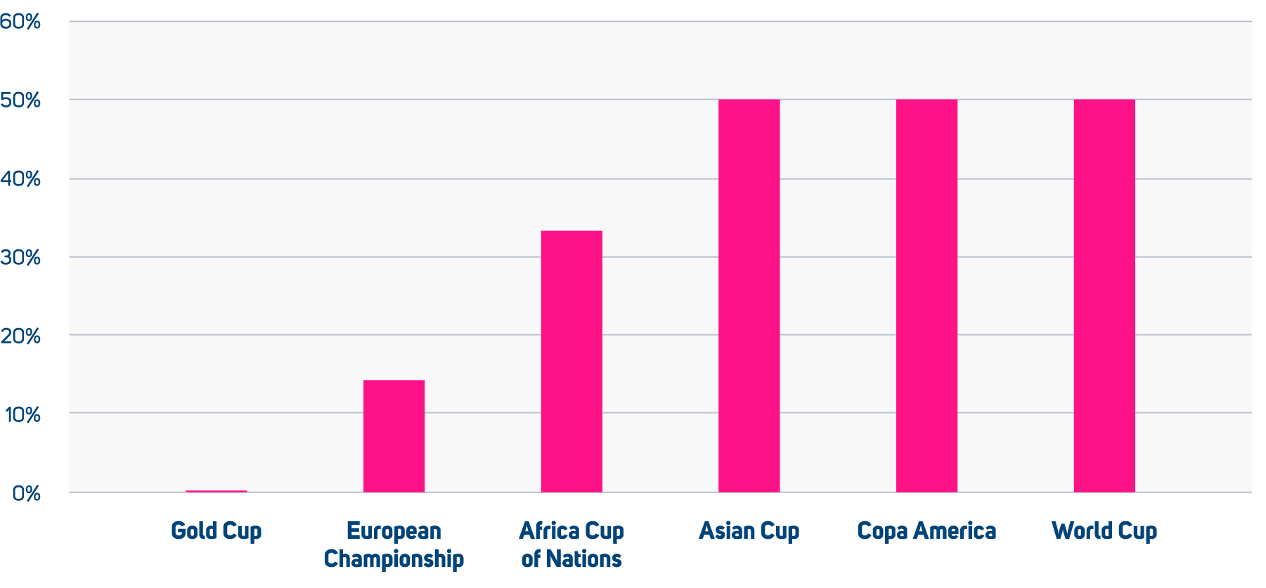 We examined 24-team continental championships – the Africa Cup of Nations for 2019, 2021 and 2023, the Asian Cup for 2019 and 2023 and the European Championship for 2016, 2020 and 2024.