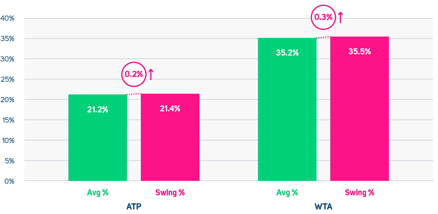 The graph below shows the percentage of swing games that occur in a match on average. These are typically tightly contested games that we often perceive as key turning points. The data suggests that if players were able to convert their break-point opportunities in these games, their overall break rate would increase by an average of 11.1% on the ATP Tour and 11.5% on the WTA Tour. The proportionally greater uplift on the men’s side is largely attributable to serve dominance on the ATP Tour, making break points easier to save.